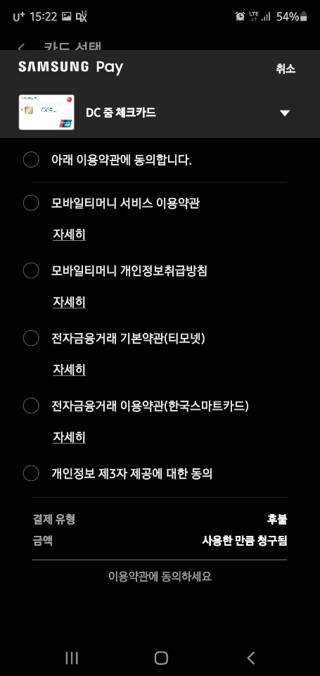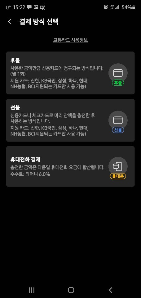 후불. 선불. 휴대전화 결제로 3가지로 나누어져 있는데
