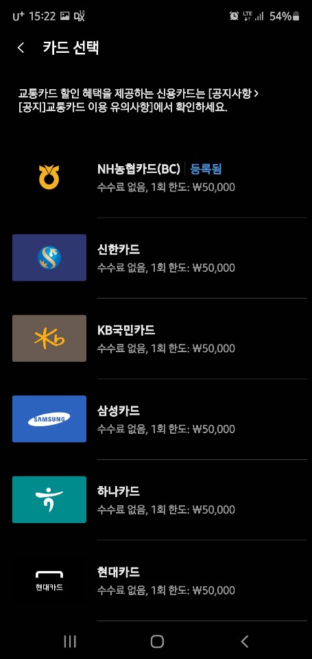 다음 화면을 보시면 등록되어 있는 카드 목록이 나오는데 저는 등록된 카드가 농협카드만 있으니